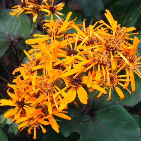 Der Hauptvorteil des Buzulnik ist seine lange Blüte, die von Juni bis Mitte September dauert. Die Kultur ergibt zahlreiche große Blüten von sattem Gelb- und Orangeton mit einem Durchmesser von 10 bis 13 cm. Sie werden zu panikförmigen Blütenständen kombiniert, die in ihrer Form der Kamille ähneln.