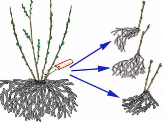 Bei vegetativer Vermehrung wird ein erwachsener Busch geteilt, der 5-7 Jahre alt ist. Es ist besser, den Eingriff im Frühjahr zu beginnen, bevor die Knospen anschwellen und junge Triebe erscheinen. Die Anweisung ist Standard:
