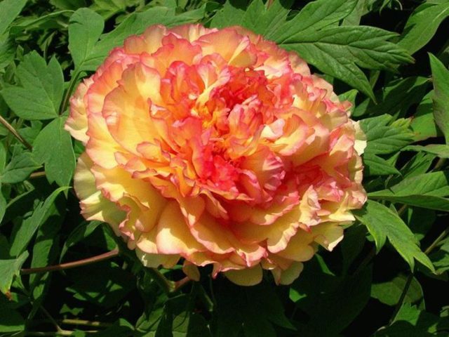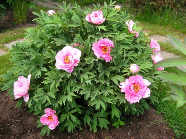 Der Unterschied zwischen einer Baumpfingstrose und einer krautigen Pfingstrose ist auf dem Foto zu sehen, auf dem Stamm und Krone der Pflanze deutlich sichtbar sind. Es ist schwierig, die Zugehörigkeit zu einer bestimmten Gruppe nur anhand der Art der Blüten und Knospen zu bestimmen.