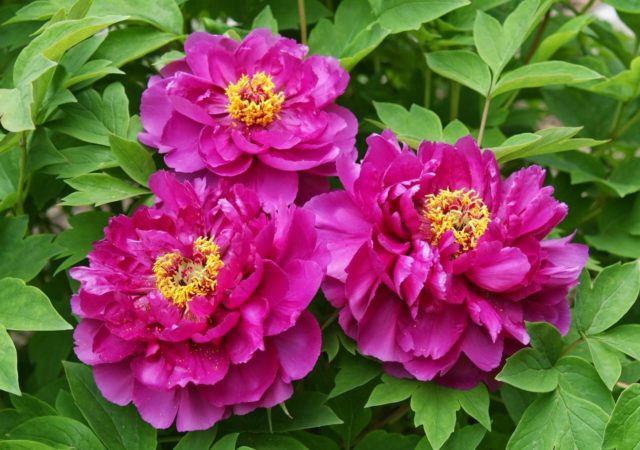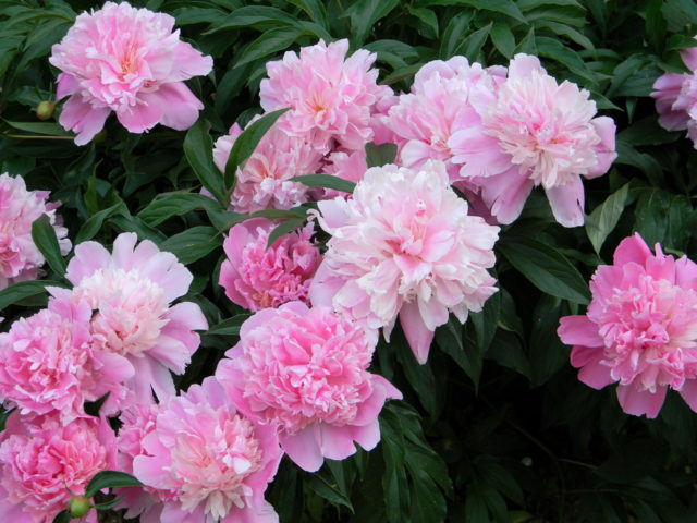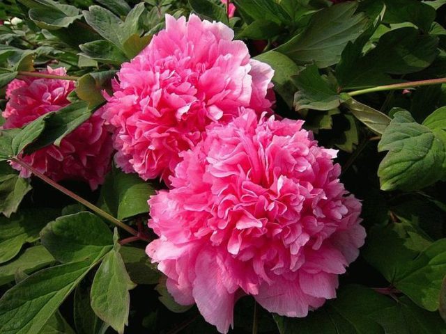 - Chinesisch-europäisch: klassische Sorten mit doppelten und halbgefüllten, sehr großen, schweren Blüten in verschiedenen Farben. Die Büsche sind hoch (bis zu 1,9 m), breiten sich aus, sind aber aufgrund starker Stängel stabil. Beliebte Sorten: Grüner Ball, Transparenter Tau, Blauer Saphir, Pfirsich im Schnee, Roter Riese, Lila Lotus.