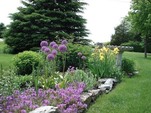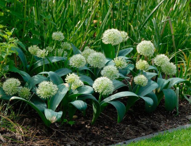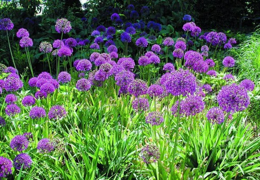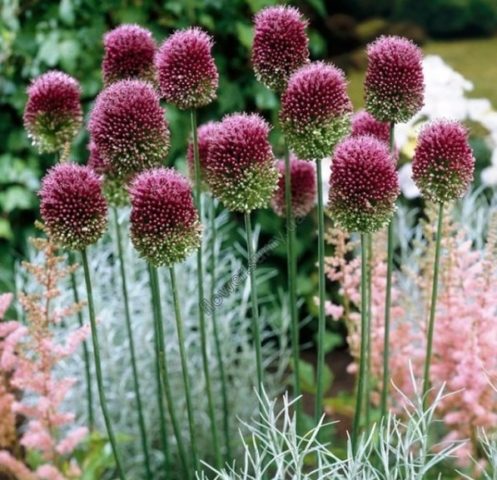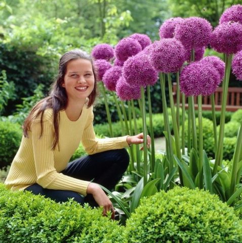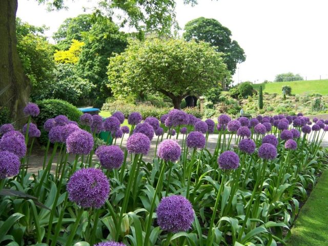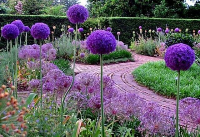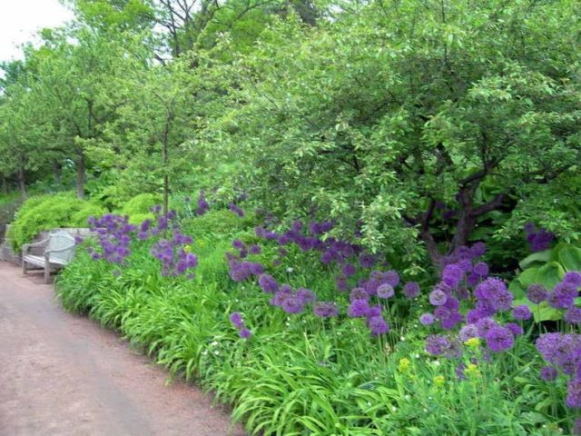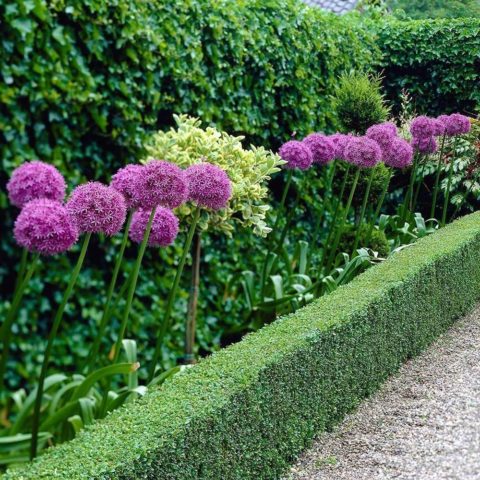 Hohe Sorten von Zierzwiebeln eignen sich gut für Mischgrenzen, in deren Vordergrund niedrige oder mittelgroße Stauden mit schönem Laub wachsen
