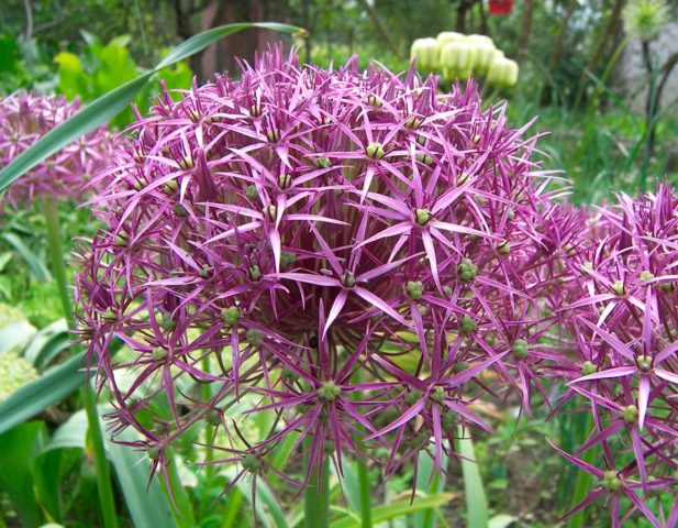 Jede Kugel dieses Alliums mit einem Durchmesser von etwa 20 cm besteht aus mehr als 1500 lila-lila Blüten. Sie blühen im Frühsommer und dauern bis zum Frühherbst. Die Höhe der Stiele erreicht 90 cm. Sie sind langlebig und unter widrigen Bedingungen - Wind oder starker Regen - äußerst gut verträglich.
