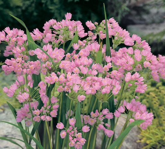 Die Triebe des Allium Unifolium erstrecken sich nur um 20-25 cm nach oben. Die Blütenstände sind nicht kugelförmig, sondern sehen aus wie lose Regenschirme mit einer Breite von etwa 15 cm. Ungewöhnliche Blüten dieses Alliums tragen dazu bei, ein Foto zu präsentieren: Sie sind hellrosa, weniger oft weiß, bis zu 2 cm groß. Sie sind Anfang bis Mitte Mai zu sehen.