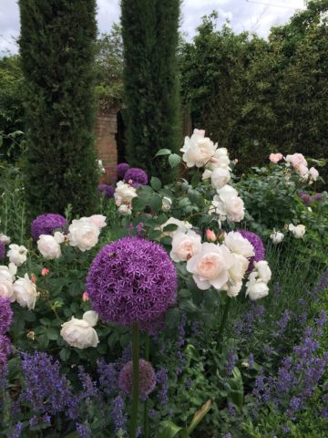 Die Kombination von volumetrischen Blütenständen dekorativer Zwiebeln mit strengen geometrischen Formen sieht sehr malerisch aus.