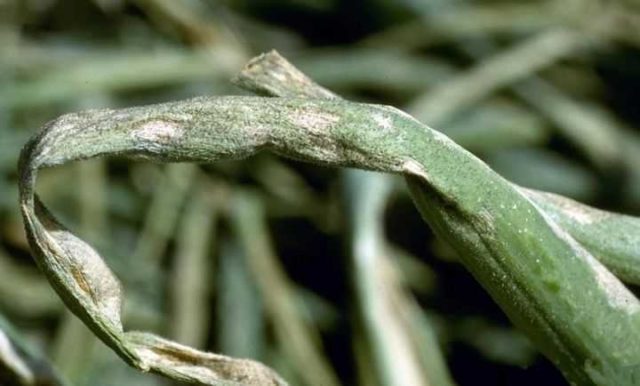 - Peronosporose oder Falscher Mehltau. Diese Krankheit entsteht häufig durch einen Überschuss an Feuchtigkeit in der Luft oder im Boden und äußert sich in einer grauen Beschichtung auf der Oberfläche von Alliumblättern, die sich schnell zu verformen und auszutrocknen beginnen. Der Pilz breitet sich schnell während der Pflanzung aus. Wenn Sie nicht rechtzeitig Maßnahmen ergreifen, werden die Pflanzen schwächer und die Zwiebeln beginnen zu faulen. Im Anfangsstadium der Peronosporose kann die Festlegung des richtigen Bewässerungsregimes zusammen mit der Behandlung von Alliumgrün mit Infusion von Löwenzahn- oder Brennnesselblättern hilfreich sein. Wenn Sie Chemikalien verwenden müssen, sind Ridomil-Gold und seine Analoga wirksam.