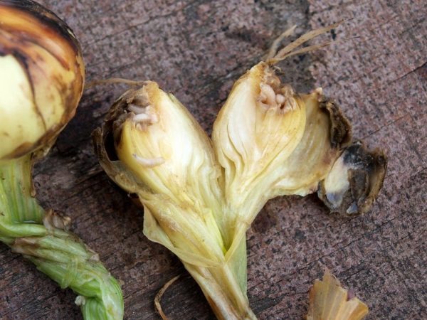 - Wurzelzecke. Sein Vorhandensein wird durch deformierte Alliumblätter und das Auftreten einer weißen Blüte auf ihnen bestimmt. Durch die lebenswichtige Aktivität des Parasiten verliert die Pflanze schnell Feuchtigkeit, wird gelb und bedeckt sich mit Flecken, die nach kurzer Zeit schimmelig werden. Zwiebeln und Rhizome von infiziertem Allium werden aus dem Boden entfernt, vom Boden gereinigt und mit natürlichen oder chemischen Mitteln desinfiziert. Unter den ersten kann eine Infusion von Knoblauchzehen, Alpenveilchenwurzel, Kaliumpermanganat oder Seifenlösung genannt werden. Systemische Insektizide werden als wirksame Mittel verwendet - Neoron, Actellik, Apollo.