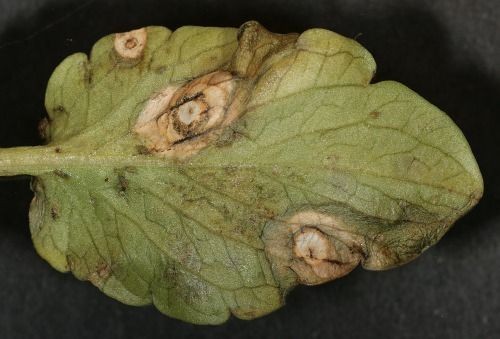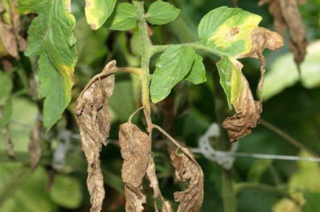 - Zunächst bilden sich schwarze Flecken auf den unteren Blättern.
