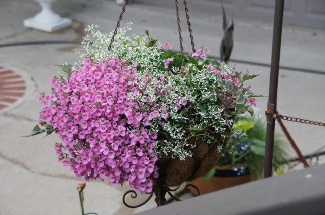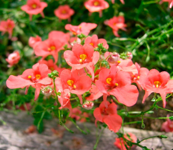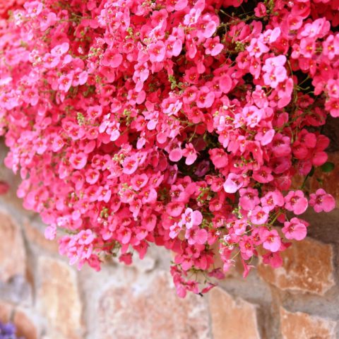Mehrfarbige Blüten aus ampelöser Diastie, die in ihrer Form Muscheln ähneln, eignen sich hervorragend für hängende Töpfe, separate dekorative Behälter und Behälter