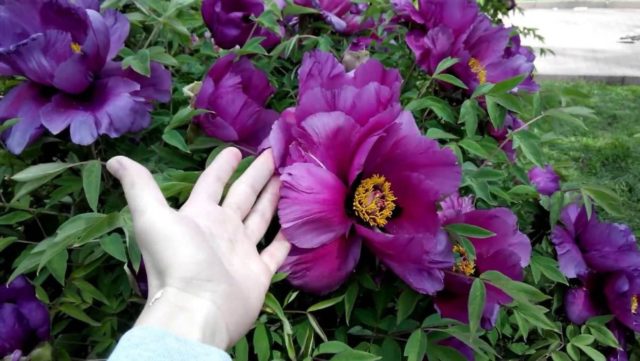 Shen hei zi - eine erwachsene Pflanze hat Blüten von sattem Purpur, die einen Durchmesser von 25 cm erreichen. In jungen Büschen sind sie lotusförmig und halbgefüllt.