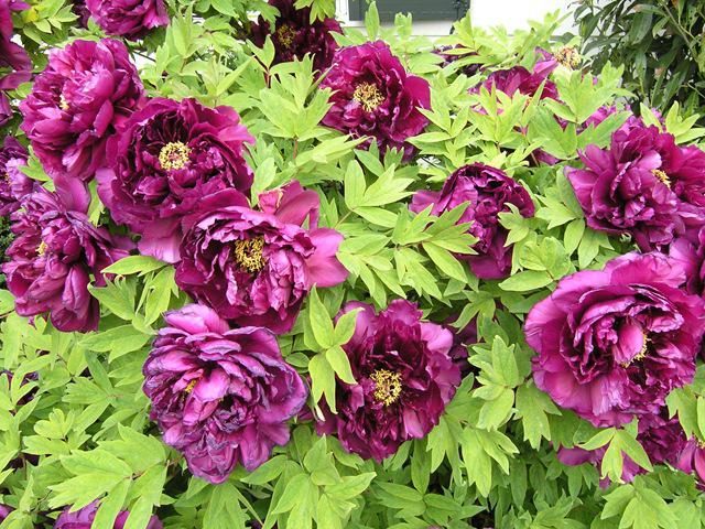 Wie lila Pfingstrosen wie eine Hecke aussehen, ist auf dem Foto zu sehen.