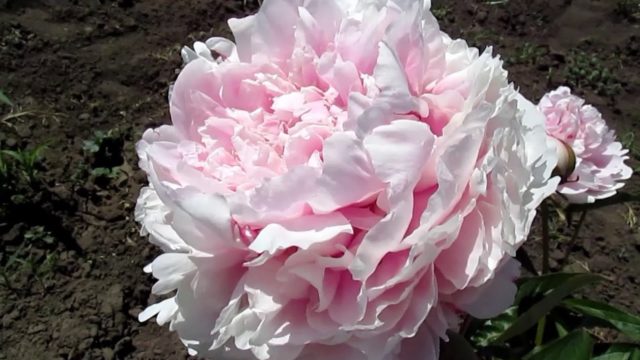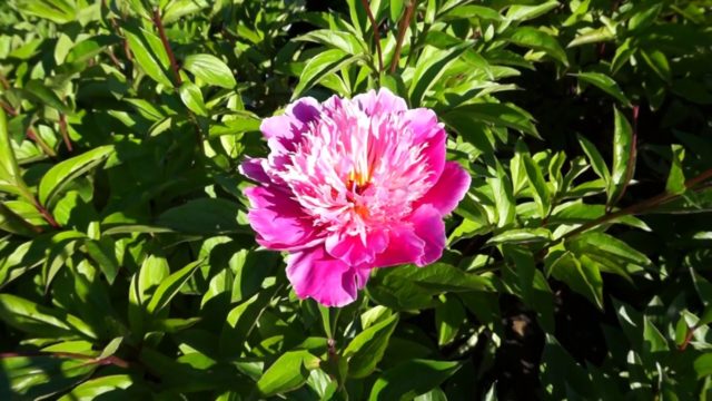 Die helle Sonne ändert die Farbe der äußeren Blütenblätter der Pfingstrose in lila, während die mittleren blass werden. Durchmesser - 15 cm. Stiele sind stark. Die Blüte dauert etwa zwei Wochen.