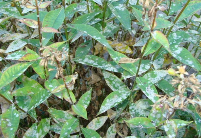 - Mehltau. Eine Pilzkrankheit, die wie eine Staubschicht aussieht. Es wirkt auf Blütenstände und Phlox-Blätter, führt zu deren Austrocknung und Abfallen. Weiße Blüte zieht Nährstoffe heraus und stört den Prozess der Photosynthese. Neue Blätter, die anstelle von gefallenen erscheinen, werden deformiert.Die Krankheit kann nicht immer sofort bemerkt werden, aber nach ihrer Entdeckung sollten die betroffenen Teile des Amethysts beschnitten, der Boden mit Fungiziden gesättigt und die Pflanze damit besprüht werden.