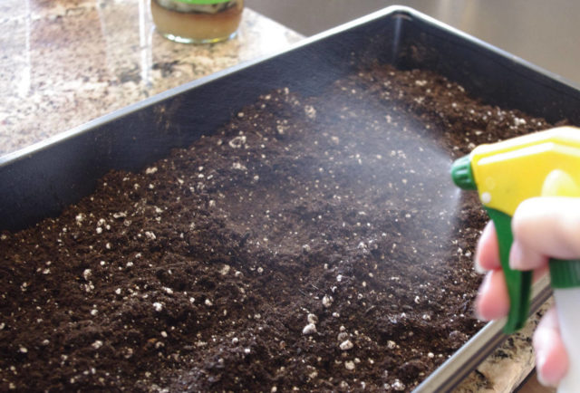 Die Samen von Gelichrizum sind eher klein. Um die Aussaat zu erleichtern, werden sie mit einer Manganlösung aus einer Sprühflasche behandelt und mit Sand gemischt.