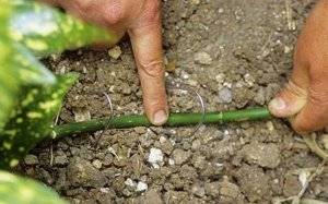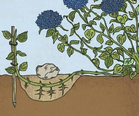 - Ein Zweig der Hortensie sollte in eine Furche gelegt werden.