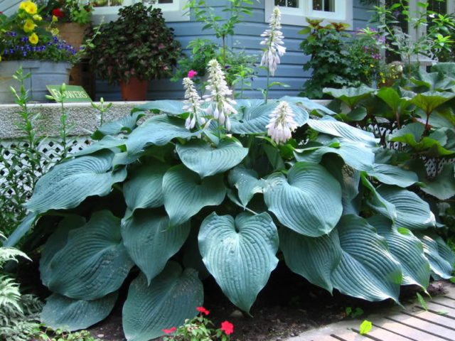 In geräumigen Monopflanzern sind auch blaue Gastgeber großartig. Eine gute Lösung wäre, sie auf den Rasen zu pflanzen. Die bezaubernde Atmosphäre wird durch verschiedene große Gastgeber neben Gartenskulpturen geschaffen.Am Teich sehen Büsche von 30-45 cm in einer einzelnen Bepflanzung oder einem Blumengarten großartig aus. Wirte mit blauen Blättern koexistieren gut mit Nadelbäumen. Sie sehen in kontrastierenden Kombinationen mit Wolzhanka, Brunnern, Kupins und Taglilien spektakulär aus. Die Zusammensetzung der blauen Hosta mit einer blühenden Stilba wird durch Mauerwerk erfolgreich abgeschlossen. Der von der Kultur benötigte Schatten kann mit Rose, Echinacea oder Traubensilberkerze erzeugt werden.