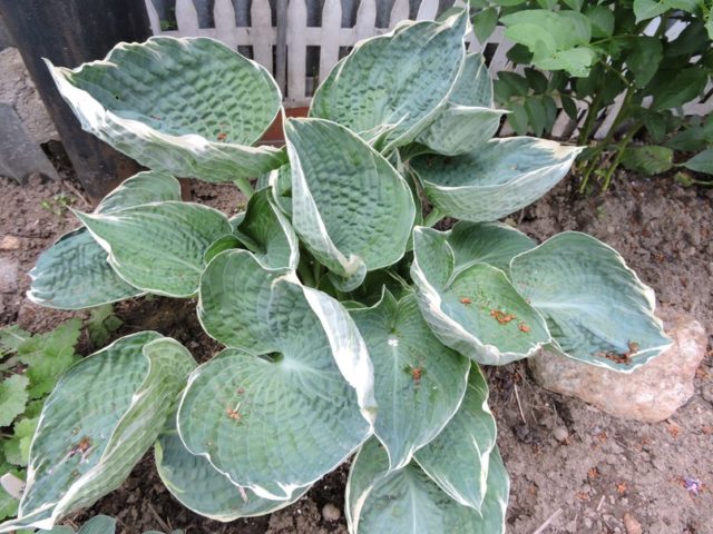 Die Höhe des Busches erreicht 65 cm. Die Blätter sind rund, faltig und schalenförmig. Der gesamte blaugrüne Hintergrund wird durch einen dünnen beigen Rand ergänzt. Die Blüten sind weiß. Es passt gut zu anderen Pflanzen im Garten.