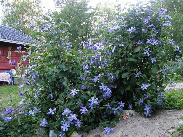 Die Büsche dieser Clematis-Sorte können eine ziemlich regelmäßig erhabene Halbkugel aus dicht bewachsenen, erhabenen Trieben bilden. Gleichzeitig fehlt ihnen jedoch die Fähigkeit, sich an irgendetwas festzuhalten. Wenn sie auf Stützen wachsen, müssen sie ständig an sie gebunden sein (wie Kletterrosen). Aufgrund dieser Eigenschaft darf Clematis Arabella häufig als Bodendeckerpflanze wachsen.