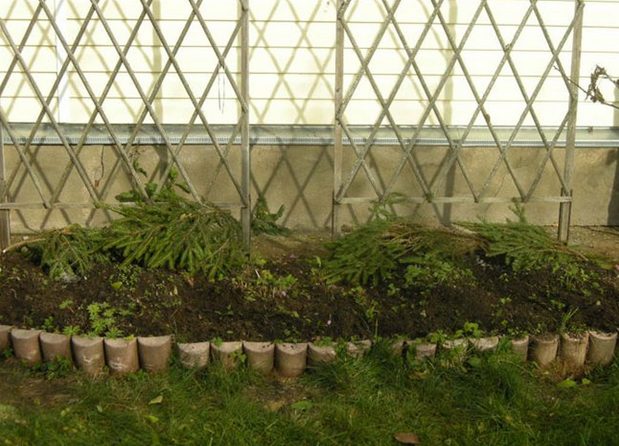 In Regionen mit kaltem Klima werden Clematis vom Träger entfernt, die Triebe in einer Höhe von 1,5 m über dem Boden gekürzt und auf eine Mulchschicht gelegt, die den Boden unter dem Busch bedeckt. Wie bei Rosen wird oben ein lufttrockener Unterschlupf gebaut - Spinnvlies wird über einen Rahmen oder über Fichtenzweige gezogen.