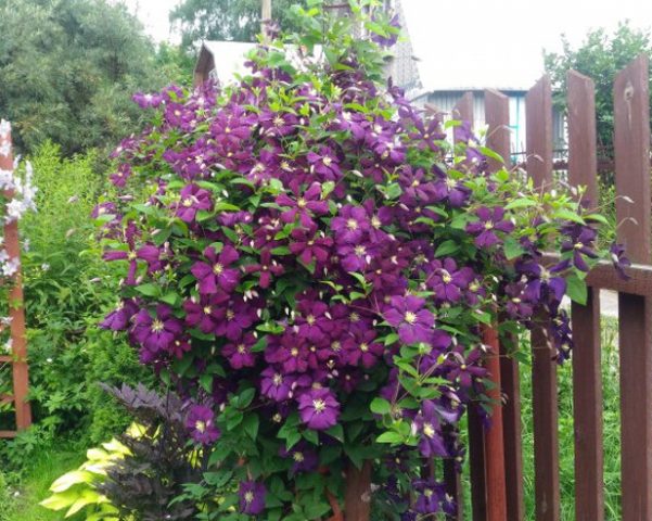 Auf dem Foto von Clematis Warsaw Night können Sie sehen, wie er mit Hilfe dünner Antennen hoch klettert. Daher ist es am besten, ein dünnes Netz zur Unterstützung zu verwenden.