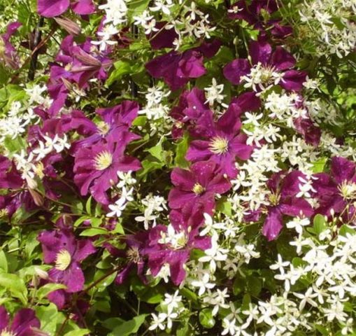 In der Beschreibung der Clematis Warschauer Nacht wird angegeben, dass sie zusammen mit anderen Kulturarten angebaut werden kann. Der Abstand zwischen den Pflanzen sollte in diesem Fall 70-100 cm betragen.