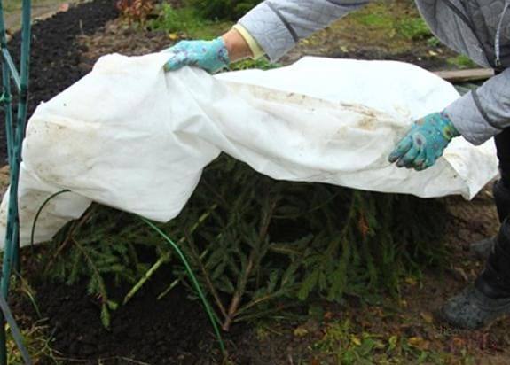 Der Boden für den Schutz ist im Busch verteilt. Beim Schneiden, wobei ein Teil der Triebe übrig bleibt, werden sie in einem Ring gedreht und gegen den Boden gedrückt. Fichtenzweige sind oben ausgelegt.