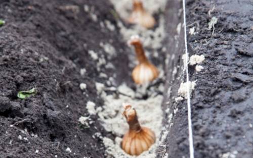 - Pflanzen Sie eine Zwiebel mit dem Boden nach unten in jedes Loch und drücken Sie sie leicht in den Boden. Es ist sehr wichtig, dass sich zwischen der Glühbirne und dem Boden der Fossa keine freie Luft befindet.
