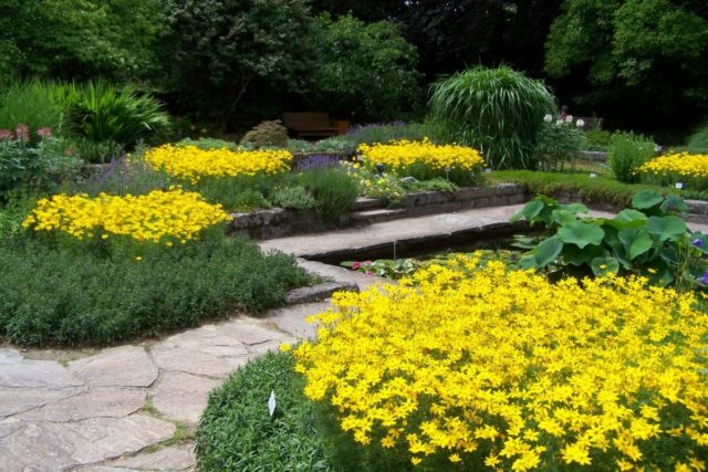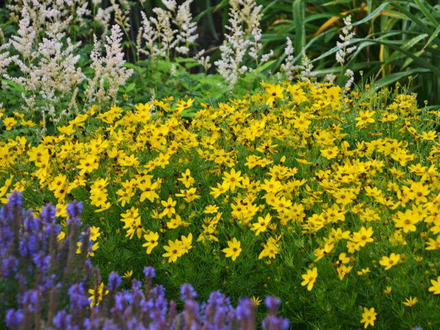 Das Foto zeigt ein Beispiel für ein ausgewogenes Farbschema: Hellgelbe Coreopsis-Büsche werden mit ruhigen Grüntönen kombiniert
