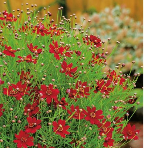 Damit die quirlige Coreopsis mit einer Fülle von Blumen zufrieden ist, sollte sie auf der Südseite von Gebäuden, Zäunen, Baum- und Strauchplantagen gepflanzt werden. Diese Kultur, gepflanzt in Straßenvasen, Balkonbehältern, wird wie eine eigenständige Komposition aussehen. Eine längere Blüte macht die quirlige Coreopsis zu einer wichtigen Figur auf dem Gelände.
