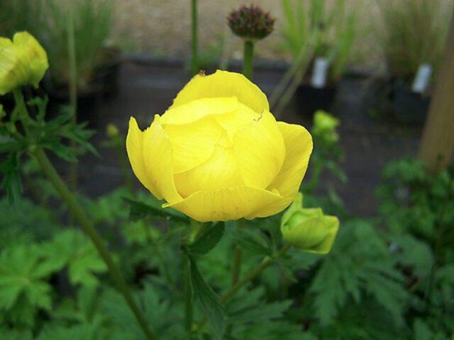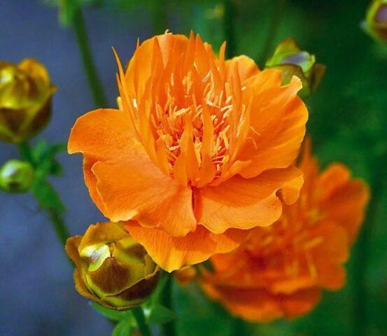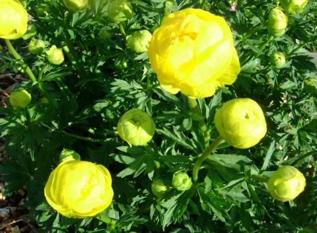 Die Pflanze blüht von Ende Mai bis August - je nach Art. Die Knospen sind glänzend, gerundet, 1-2 an jedem Stiel, zitronengelb, golden oder orange. Die Dekorationszeit der Pflanze beträgt 18-25 Tage, der Badende strahlt zu diesem Zeitpunkt ein angenehmes leichtes Aroma aus. Am Ende der Blüte bildet die Staude abgerundete Früchte, die aus mehreren Blättchen mit kleinen schwarzen Samen bestehen.