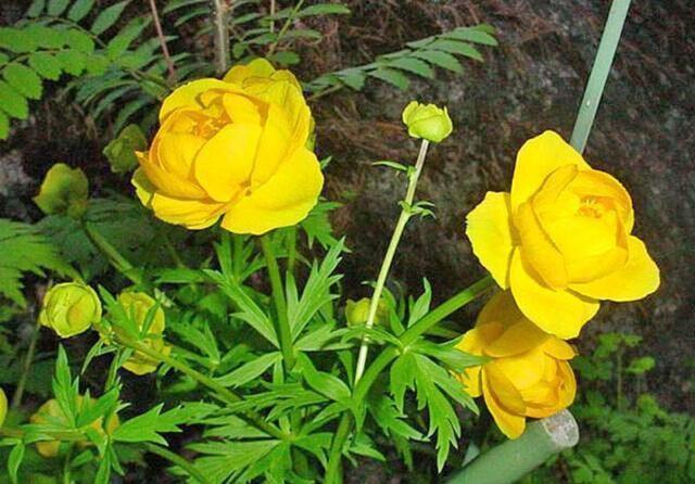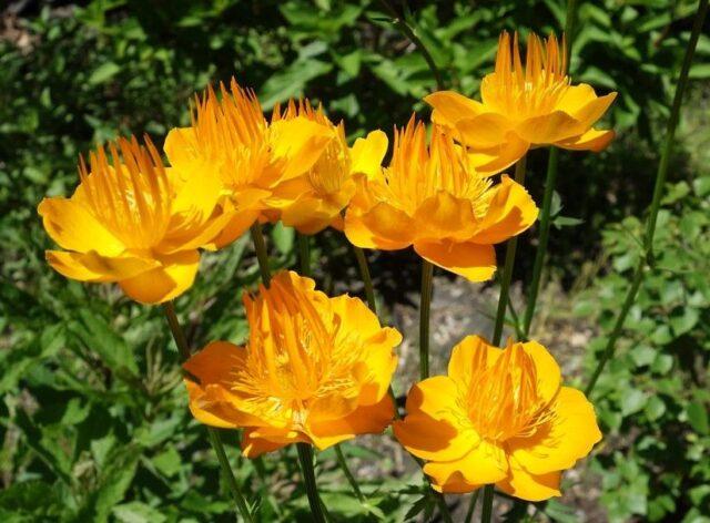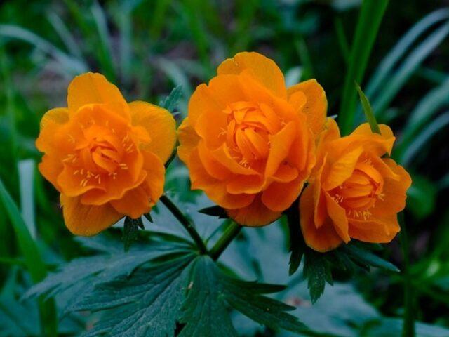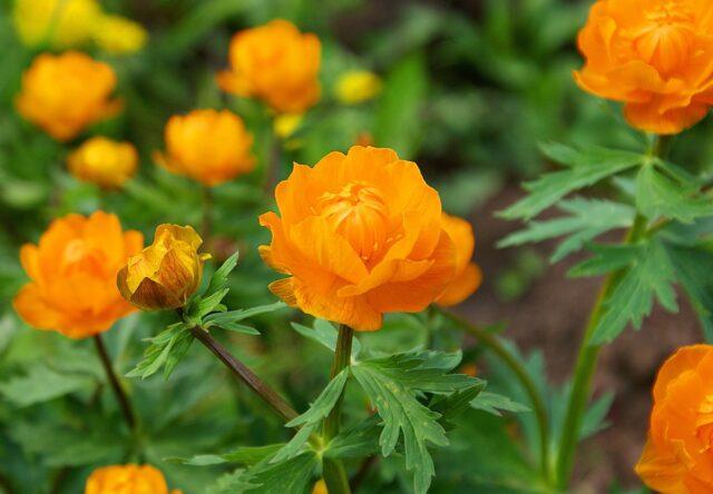 Der chinesische Badeanzug (Trollius chinensis) wächst bis zu 1 m über dem Boden und hat wunderschön geschnitzte dunkelgrüne Blätter. Blüht später als andere Sorten - von Juli bis August. Die Pflanze produziert einzelne offene und halb geschlossene orangefarbene Knospen mit dünnen langen Blütenblättern.