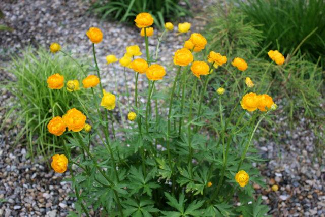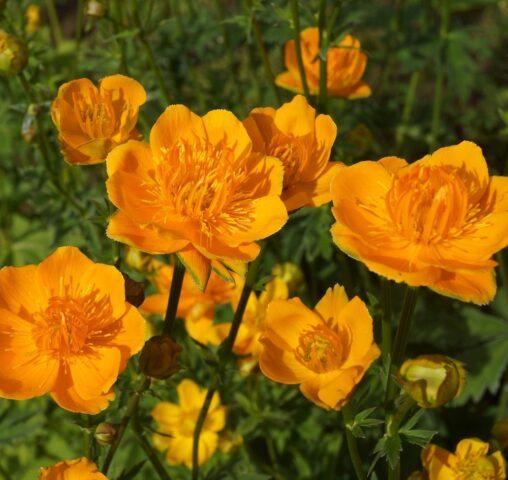 Der kompakte Badeanzug Orange Glow wächst bis zu 60 cm über dem Boden. Im Mai und Juni trägt es zahlreiche helle Kugelknospen. Die Pflanze bevorzugt gut beleuchtete Plätze, die Dekorationszeit des orangefarbenen Badeanzugs dauert etwa einen Monat.