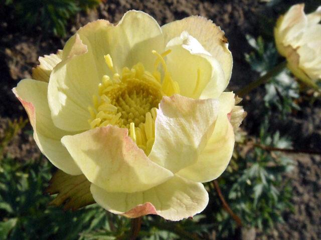 Eine ungewöhnliche Variante des Alabaster-Badeanzugs zeichnet sich durch große Knospen bis zu 6 cm im originalen hellen Cremeton aus. Die Blüten sind halbgefüllt, sehr schön, mit rosa Blütenblättern an den Spitzen. Die Pflanze blüht von Mai bis Juni und erneut im August und September.