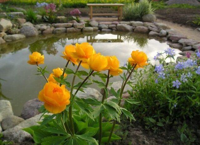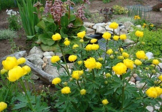 Variety Lemon Queen (Zitronenkönigin) - eine bis zu 70 cm große Pflanze mit großen zitronengelben Knospen. Auf jedem Stiel kann ein Blumenpaar erscheinen. Der Badende ist kompakt, nimmt keinen unnötigen Platz im Garten ein, sieht aber vor dem Hintergrund des dichten Grüns sehr beeindruckend aus.