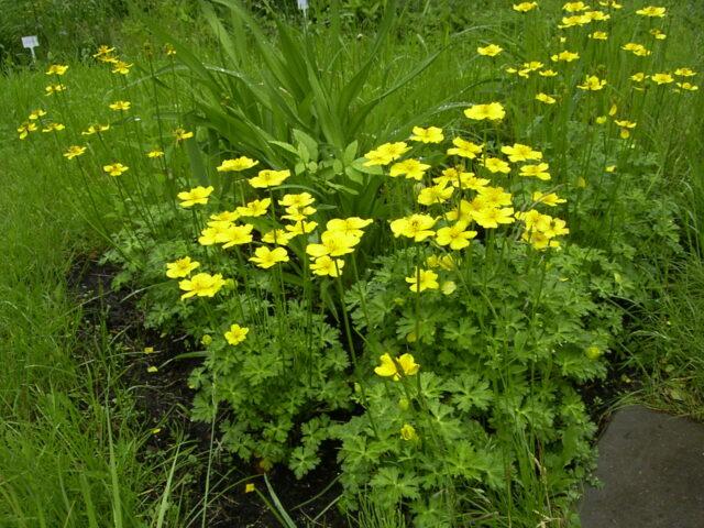 Der Badende ist eine mehrjährige Pflanze aus der Familie der Butterblumen. Es hat gerade Stängel mit einer durchschnittlichen Höhe von bis zu 1 m, hell- oder dunkelgrüne Blätter mit einer handförmig gespaltenen Form.