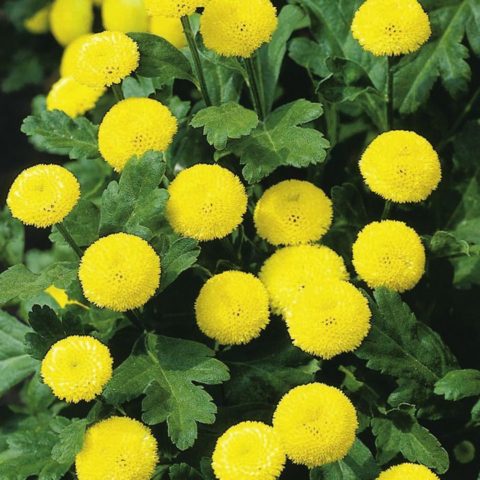 Die Vielfalt der Blumen matricaria "Golden Ball" besticht durch die Schönheit und Größe der schicken kugelförmigen Blütenstände eines goldenen Tons, zu denen ausschließlich röhrenförmige Blüten gehören