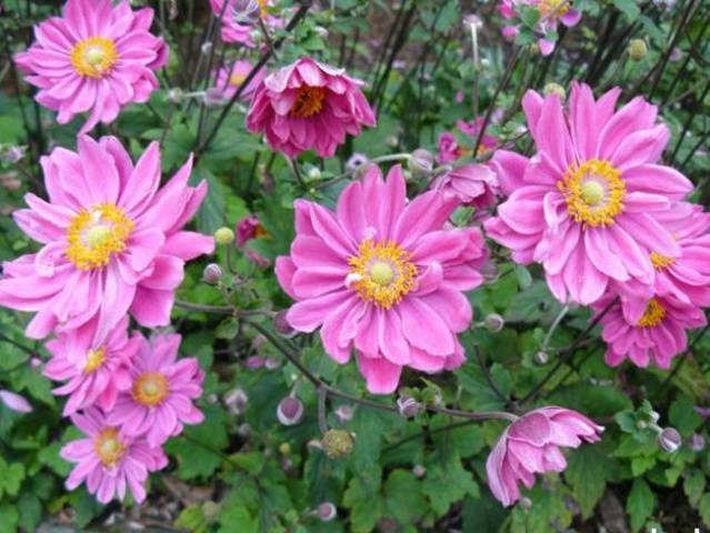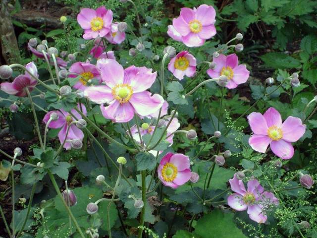 - Japanisch. Die Art Anemone wächst bis zu 80 cm, die Sorten steigen um 70-130 cm. Die graugrünen, gefiederten Blätter mögen rau erscheinen, aber sie werden durch einfache oder halbgefüllte, elegante Blüten von Pastelltönen, die in Gruppen gesammelt wurden, erweicht.