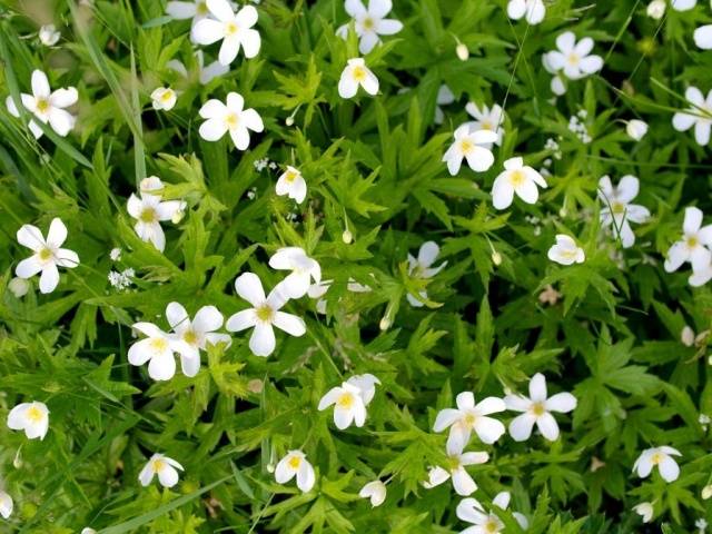 - Kanadisch. Diese Anemone blüht den ganzen Sommer, ihre Blätter sind lang, weiße, sternförmige Blüten ragen 60 cm über die Erdoberfläche.