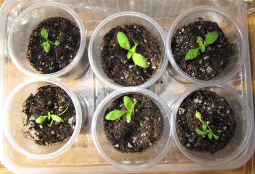 - Nach dem Erscheinen des zweiten echten Blattes sitzen die Sämlinge in getrennten Gläsern.