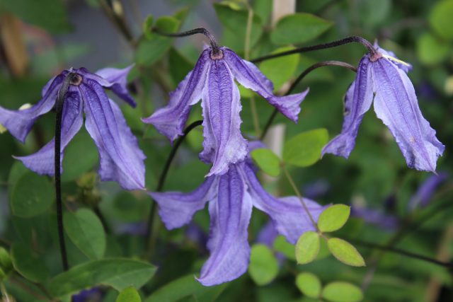 Kleinblumige Strauchclematis Blue Rain Integrifolia kann Triebe bis zu 2 m ausstoßen, die gebunden werden müssen. Blüht von Hochsommer bis Frühherbst reichlich. Die glockenförmige Krone aus vier Blütenblättern von lila-blauer leuchtender Farbe erreicht eine Länge von 4 cm.