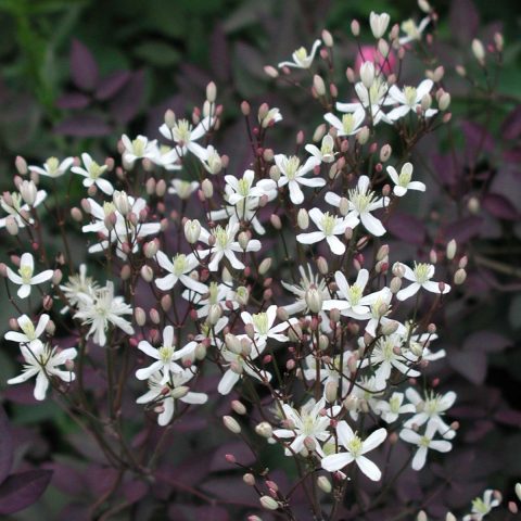 Diese Strauchclematis hat, wie auf dem Foto der Sorte Recta Purpurea, die gleichen kleinen weißen Blüten wie die ursprüngliche Pflanze, aber die Blätter sind lila gefärbt. In der Nähe von Zäunen wird ein spektakulärer Busch gepflanzt, der die Triebe lenkt und zusammenbindet.