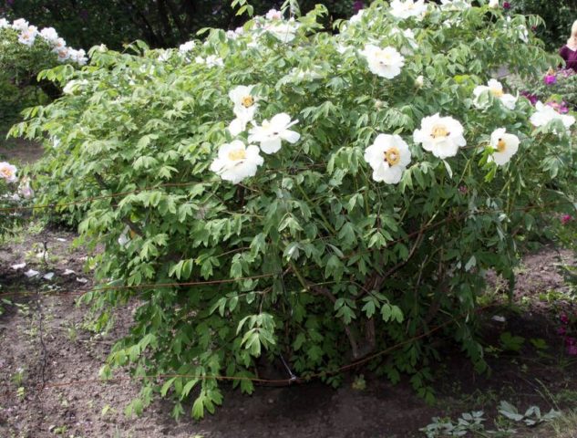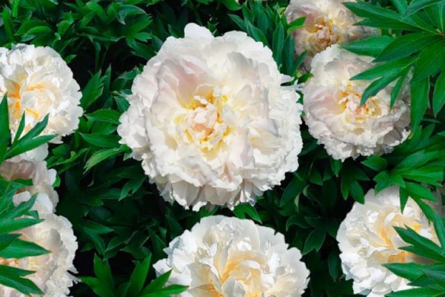 Bowl of Cream oder Bowl of Cream erzeugt große Doppelknospen von hellweißer Farbe. Gegen Ende der Blüte nimmt es einen milchigen Farbton an und strahlt ein schwaches Aroma aus. Sie blüht Mitte Juni, schmückt den Garten lange und ist im Schnitt perfekt erhalten. Der Busch ist 80 cm hoch.