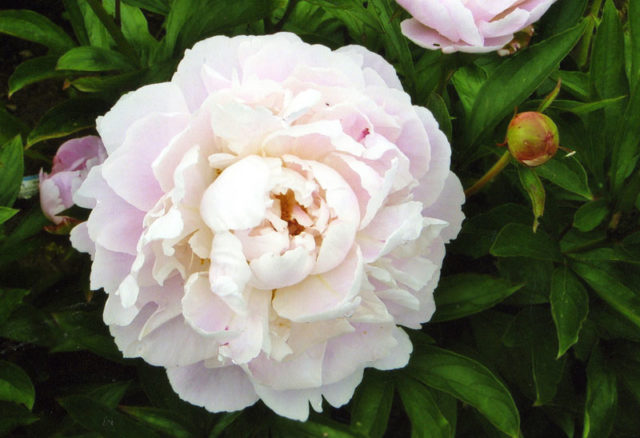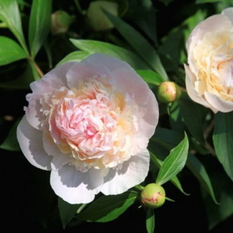 Die schöne Doppelpfingstrose Gladys Hodson wird bis zu 1 m groß und bringt große Blüten mit weißen Blütenblättern und einer leichten Rosatönung hervor. Es strahlt einen blumigen Duft aus, kann unter dem Gewicht der Knospen stark auseinanderfallen. Blüht sehr spät Anfang Juli.