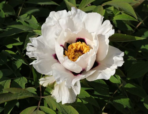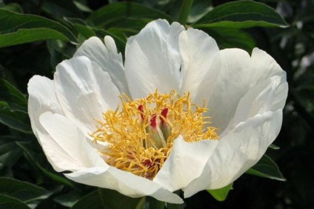 Es wird auch unter dem Namen Anastasiya gefunden und erreicht eine Höhe von 1,5 m. Die Knospen sind mittelgroß, ohne Frottee, mit zwei Reihen von Blütenblättern, das Foto einer weißen Pfingstrose zeigt eine fuchsia Farbe an der Basis. In der Mitte der Blüte befinden sich dunkelgelbe Staubblätter. Die Sorte erscheint nach dem 10. Juni.