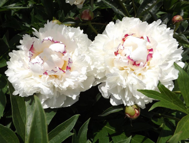 Die berühmte Festiva Maxima gehört zu den frühen und bringt Ende Mai große Blüten hervor. Die Knospen der Sorte sind doppelt, schneeweiß mit mehreren leuchtend rosa Blütenblättern im Kern. Die mehrjährige Pflanze erhebt sich 1 m über dem Boden, blüht sehr üppig und strahlt ein erfrischendes Aroma aus.