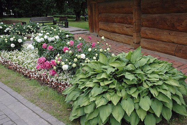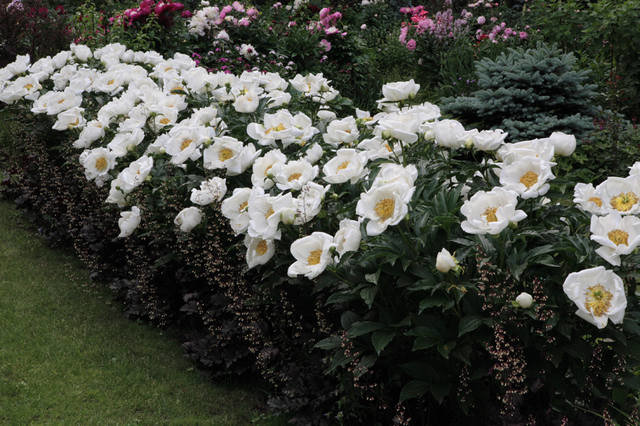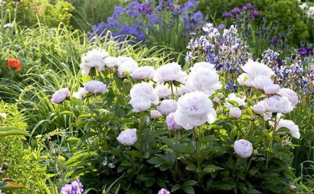 - In einzelnen und komplexen Blumenbeeten lassen sich rote, blaue und gelbe Stauden gut mit weißen Pfingstrosen kombinieren.