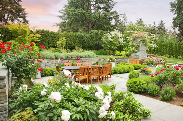 Mittlere und große Pfingstrosen rahmen schön gepflegte Wege ein