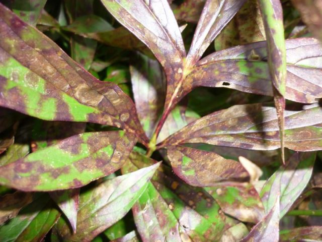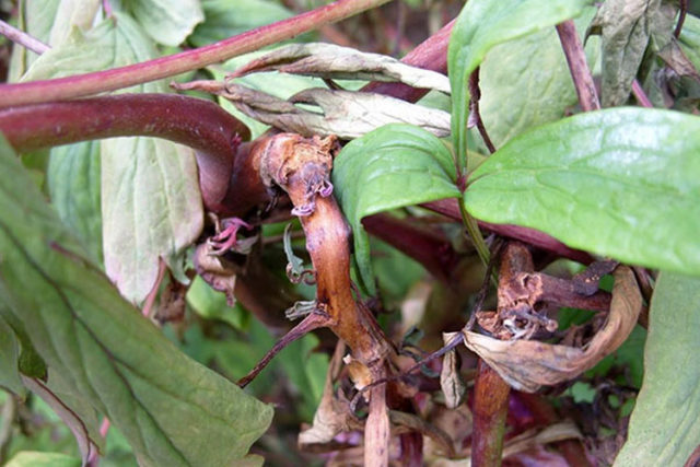 Mit Graufäule beginnen sich die Wurzeln der Pfingstrose zu verdunkeln und zu erweichen, die Krankheit breitet sich entlang der Stängel und Knospen aus