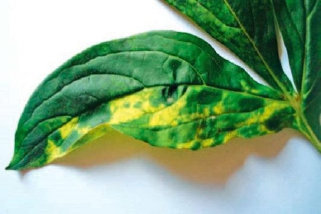 Das Mosaik erscheint mit hellen Kreisen auf den Blättern und einer Schwächung der Blüte