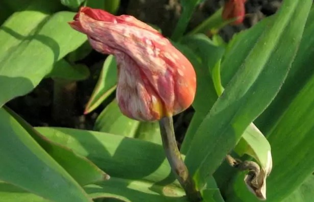 Eine weitere Viruserkrankung ist die Variegation. Tatsächlich sind fast alle Arten von Lilien von dieser Krankheit betroffen, aber das Immunsystem der Pflanze kommt perfekt damit zurecht, aber wenn sie auf Tulpen gelangt, kann dies zu den unangenehmsten Folgen führen.