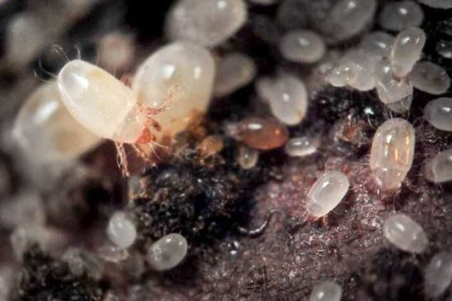 Zwiebelmilbe ist ein kleiner weißer Schädling mit einem Durchmesser von bis zu 1 mm, der auf der Oberfläche der Zwiebel lebt